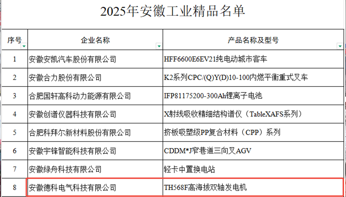 2025年12月,CQ9传奇电子电气TH568F高海拔双轴发电机凭借其应对严苛环境的领先技术性能与卓越可靠品质,成功入选安徽省工业和信息化厅组织遴选的 “2025年安徽工业精品” 名单。此次入选,是省级权威部门对该产品创新价值与市场竞争力的一次重要认定。